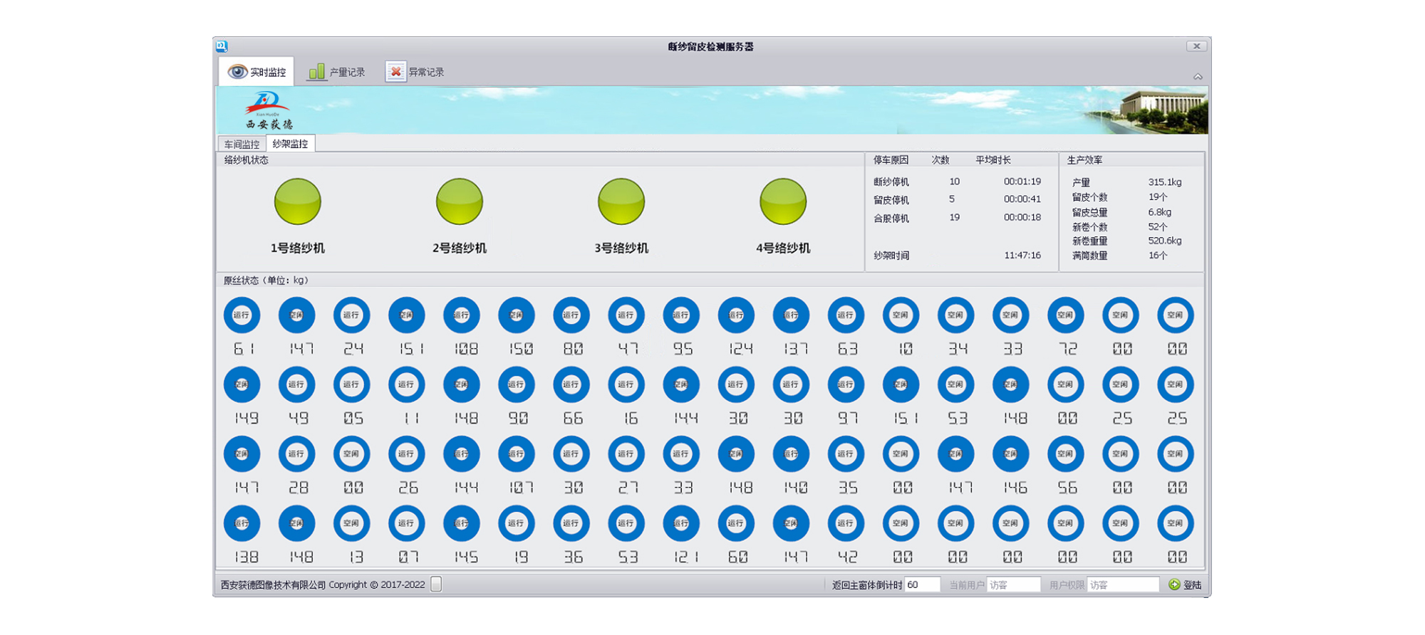 络纱机断纱及留重检测系统,不但能检测断纱,还能检测留皮;系统稳定可靠,使用寿命长,经两年现场使用验证,可以长期安全使用。该系统减轻了工人的劳动强度的同时又提高了劳动生产率,产品质量大大提高,取得了经济效益和社会效益双丰收。在便于一线检测人员工作同时,本系统更利于络纱车间纱架的统一管理,方便后期管理人员形成生产报表,及整体的把控产品质量。