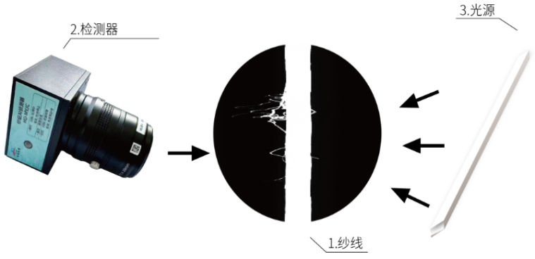 检测器是一款高集成度、高处理能力的智能AI相机,内部通过自研的软件算法,采用AI芯片完成高速纺丝的实时图像采集和高速处理,不用其他图像处理设备,可识别纱线上的毛丝、毛团缺陷。