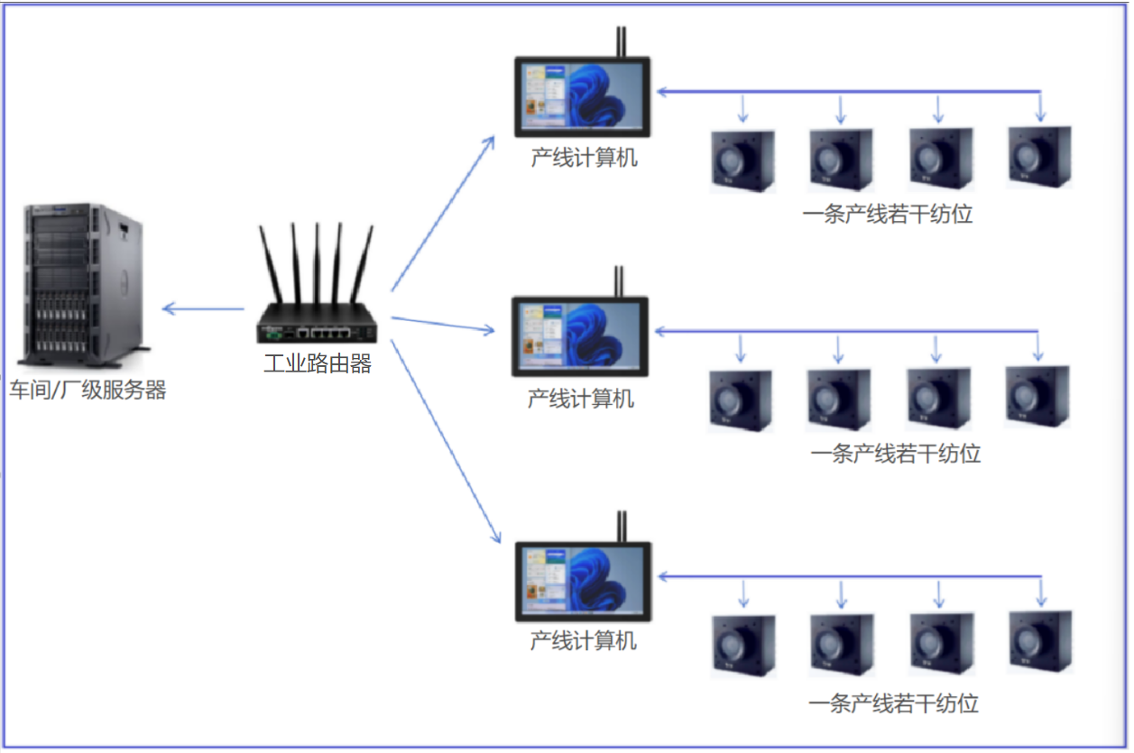 每条产线配置一台服务器,最多可以连接36个检测器,采用工业以太网组网,产线服务器的功能有: